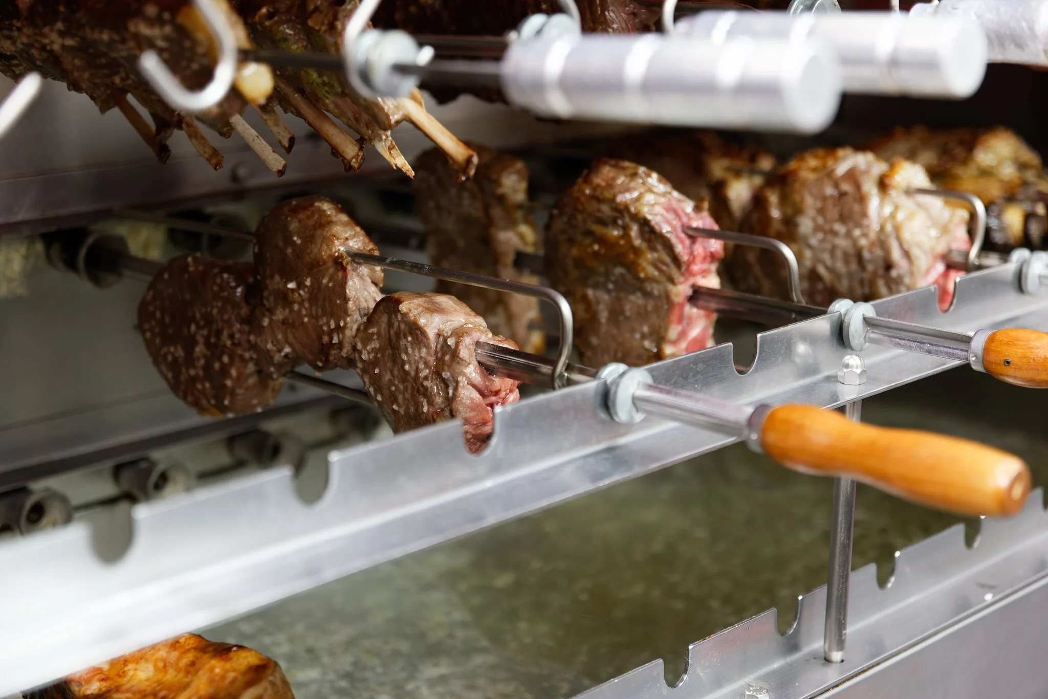 .Juicy, fire-roasted chicken drumsticks cooked churrasco-style on skewers until lightly crisp outside and tender inside—served tableside straight from the skewer.